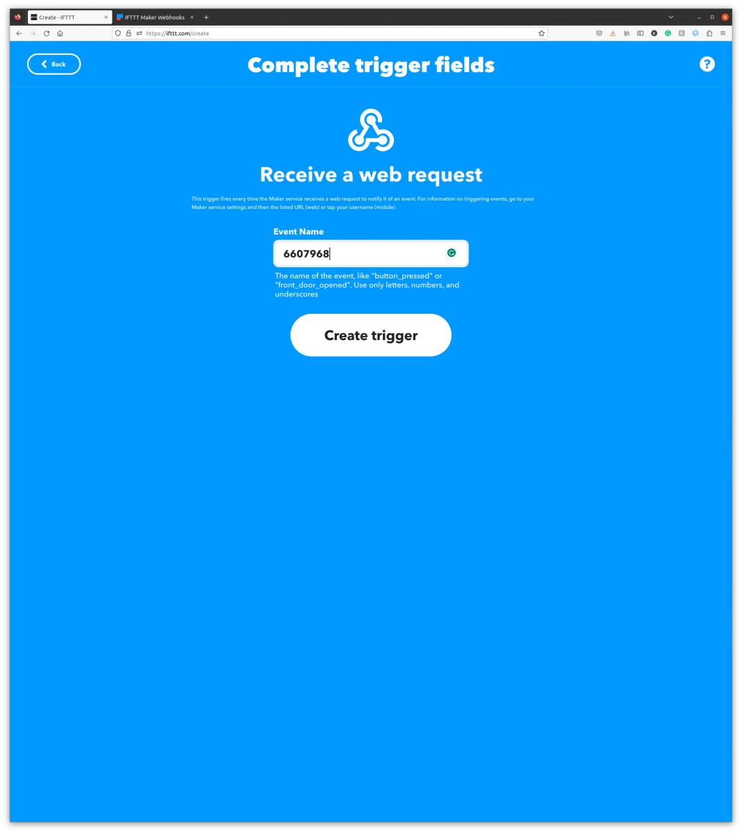 STEP 12: On the "Complete trigger fields" page, enter event named (noted in Step 1) into the "Event Name" field. Then click the "Create trigger" button.