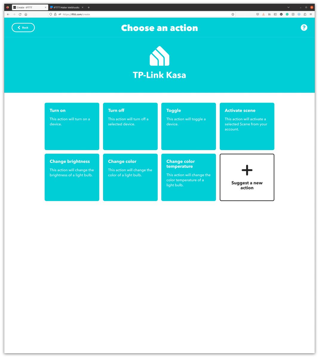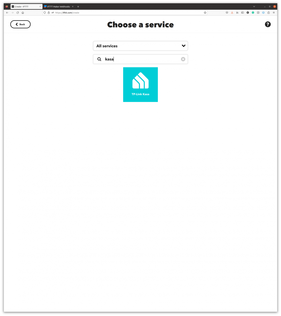 STEP 14: On the "Choose a service" page, search for your smart plug vendor/name, then click the found service button. In this example it is Kasa by TP-Link.