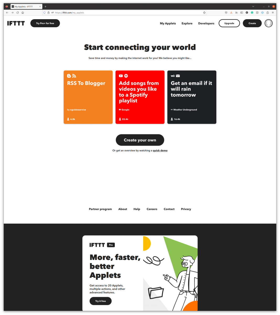 STEP 8: Go back to IFTTT.com, and click the "Create" button in the home page's top right corner.