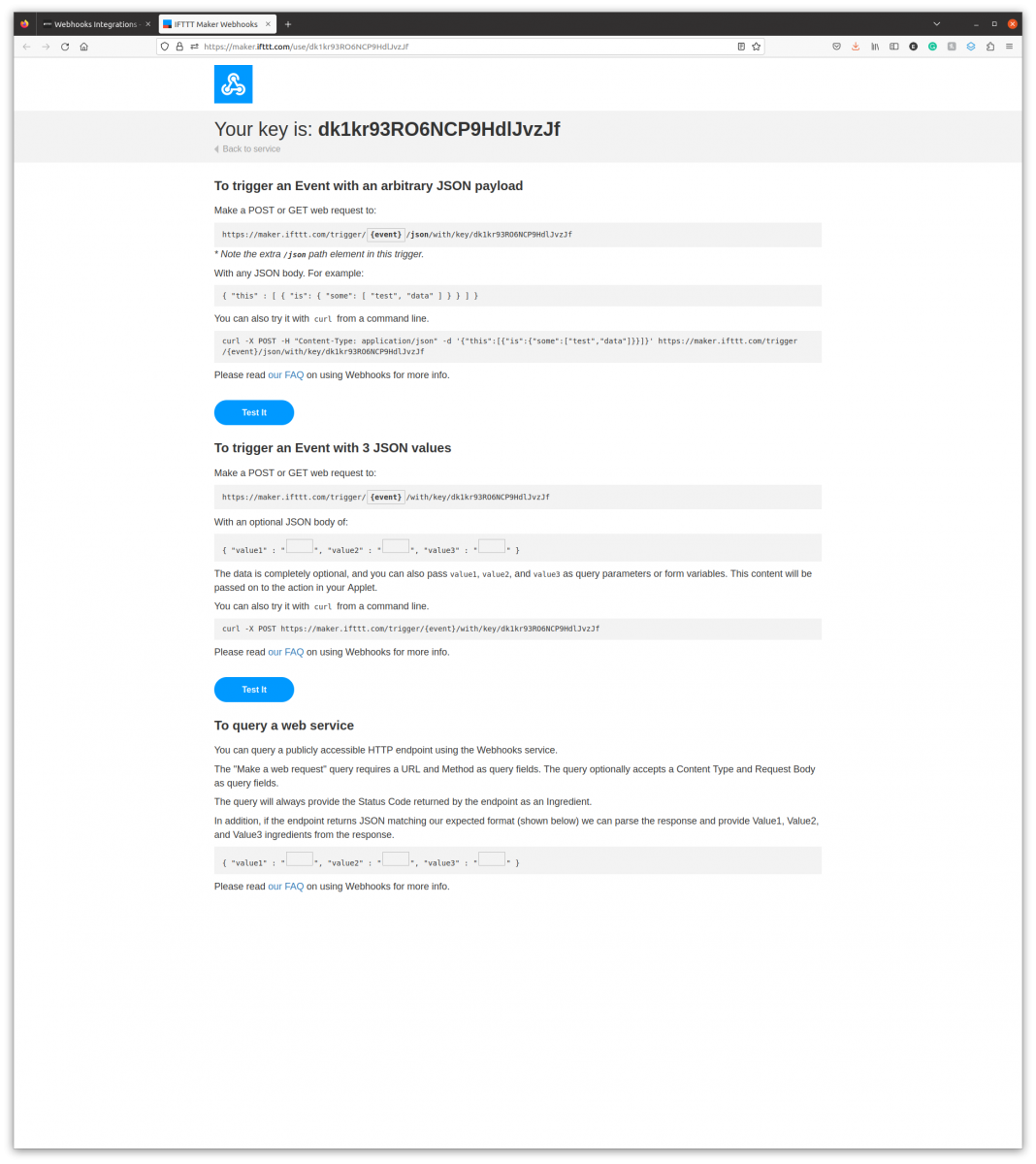 STEP 7: Go back to the device configuration page from Step 1, and paste IFTTT Key into the "IFTTT Api Key" field. Click the "Save" button to commit the change.