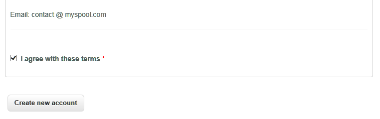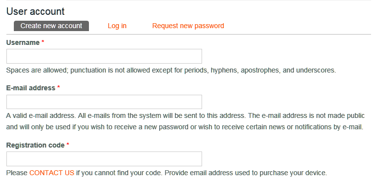 Enter your email in two places, for user name and E-mail address. Then enter your Registration Code. Read the Terms of Use and scroll down to the bottom of the page, check the box that says 'I agree with these terms' and click Create new account