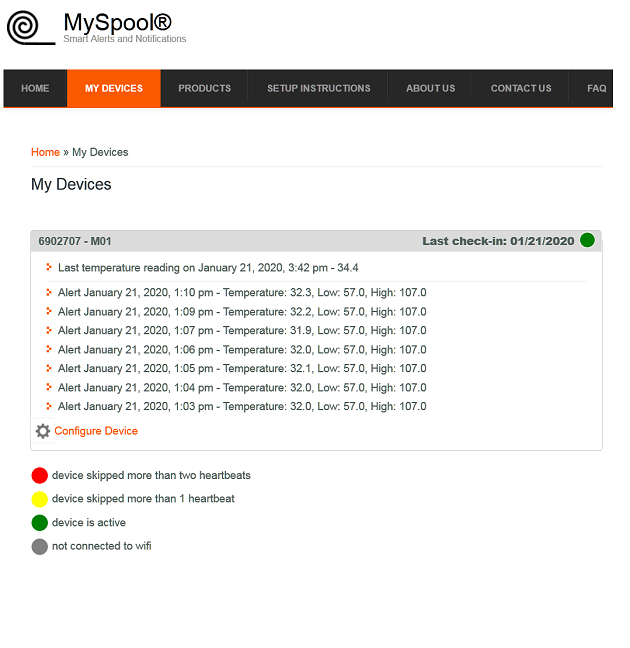 Yes there is. You must be logged in to myspool.com. Click on MY DEVICES and see the chart below your device ID and Last check-in time stamp. It will sdisplay temperature in units that you specified when you configured your device, Celcius shown below.