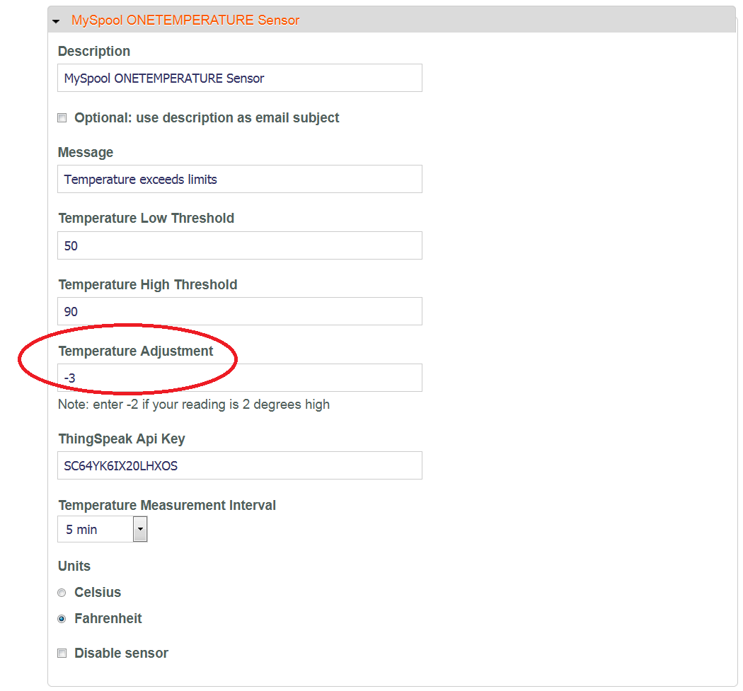High and Low Temperature Thresholds can be changed when you you login to myspool, click on MY DEVICES, and then click on MySpool Temperature Sensor. You can then select your temperature units, Celsius or Fahrenheit, and set Low and High thresholds. The thresholds set to -100 are ignored. When your changes have been entered and you clicked Save, they are saved in the cloud for your sensor. To make your sensor aware of these changes, unplug your device and plug it back in. Otherwise those changes will be transmitted to your device when it checks in, usually once a day.