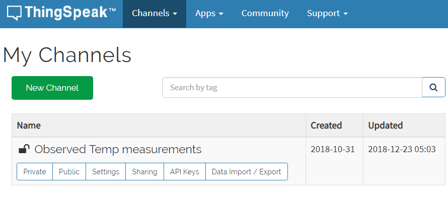 1. To setup a ThingSpeak channel, sign up for ThingSpeak first. Then login and click on Channels.