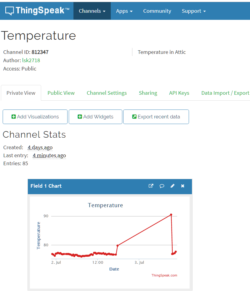 When you have sent a few data points to your channel, they will be available for display on ThingSpeak: