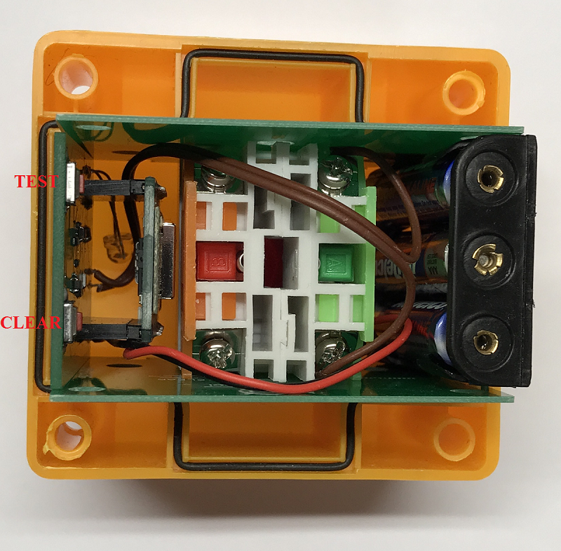 Use a phillips screwdriver and remove 4 screws from the top of the yellow cover. You will see a battery holder on one side of the push switch and a green circuit board on the other. The circuit board has two small push switches as shown here: